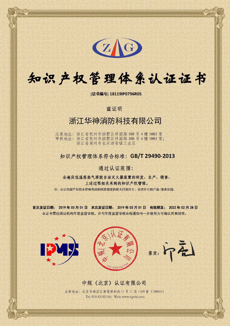 華神消防于2019年3月1日正式獲得由中規(guī)(北京)認(rèn)證公司頒發(fā)的《知識產(chǎn)權(quán)管理體系認(rèn)證證書》(證書編號:18119IP0796R0S),這標(biāo)志著我司在知識產(chǎn)權(quán)創(chuàng)造、運(yùn)用、管理和保護(hù)方面全面邁入國內(nèi)領(lǐng)先水平。
